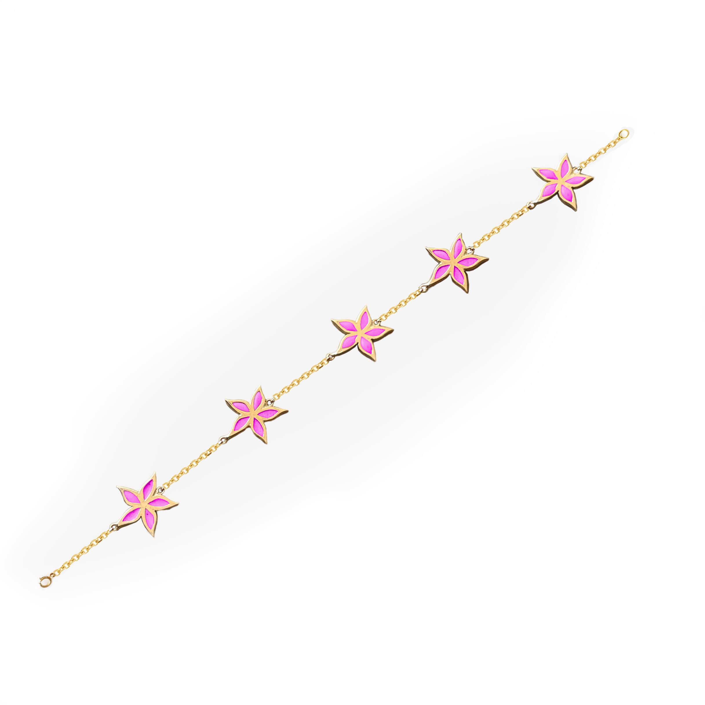 Handcrafted in 18k yellow gold with your favorite enamel color. This blossom bracelet can be worn alone or paired with a bunch of other bracelets!