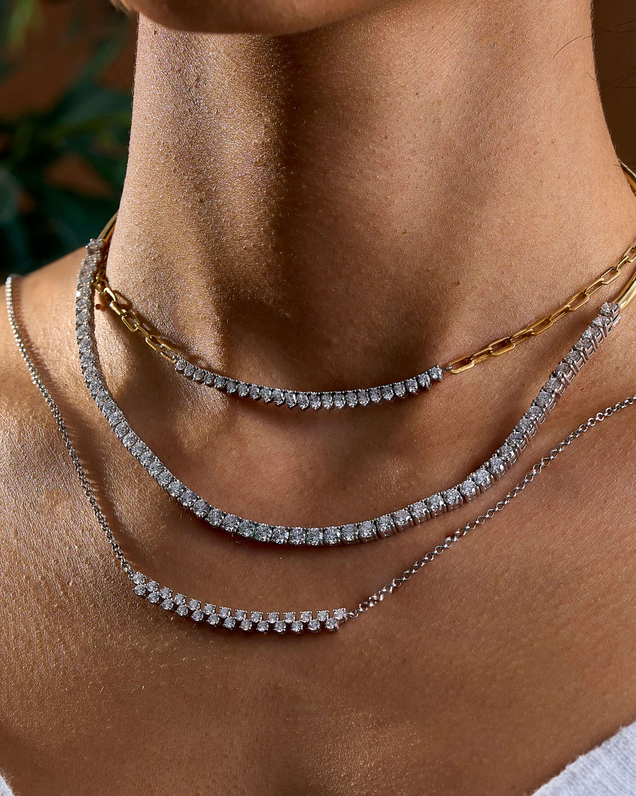 The Torque go around the neck with approx. 20 cm and diamonds go around the neck with approx. 19 cm; This is the most classic and elegant tennis necklace, Collier style with sparkly diamonds adding a luxurious shine and refined sophistication.