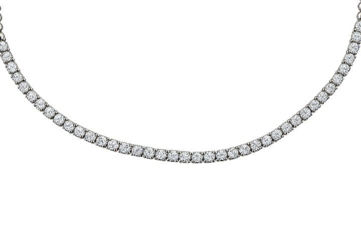This classic tennis collier is handcrafted in 18k gold features brilliant lab-grown diamonds, each 0.15 carats , meticulously set in a seamless row for a radiant finish.The half collier goes around the neck with approx. 18.5 cm. IGI Certified.